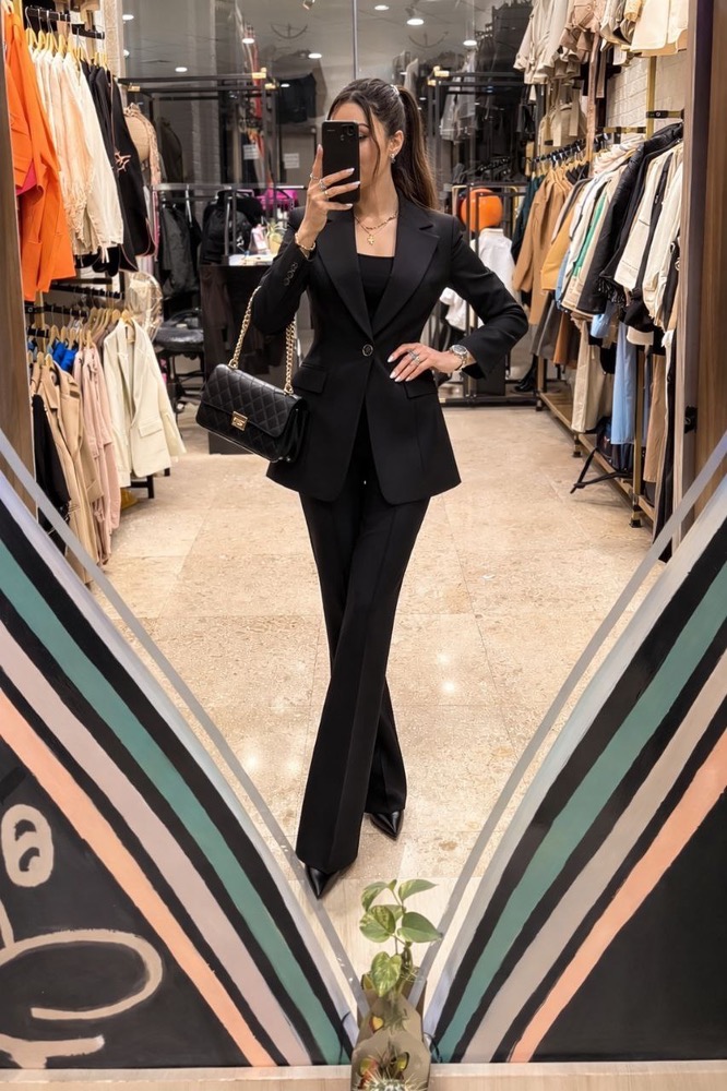 کت دارای برشهای اصولی و دوخت تمیز بوده که فرم اندام را زیباتر نشان میدهد و شلوار با الگوی استاندارد، راحتی و وقار را همزمان فراهم میکند.